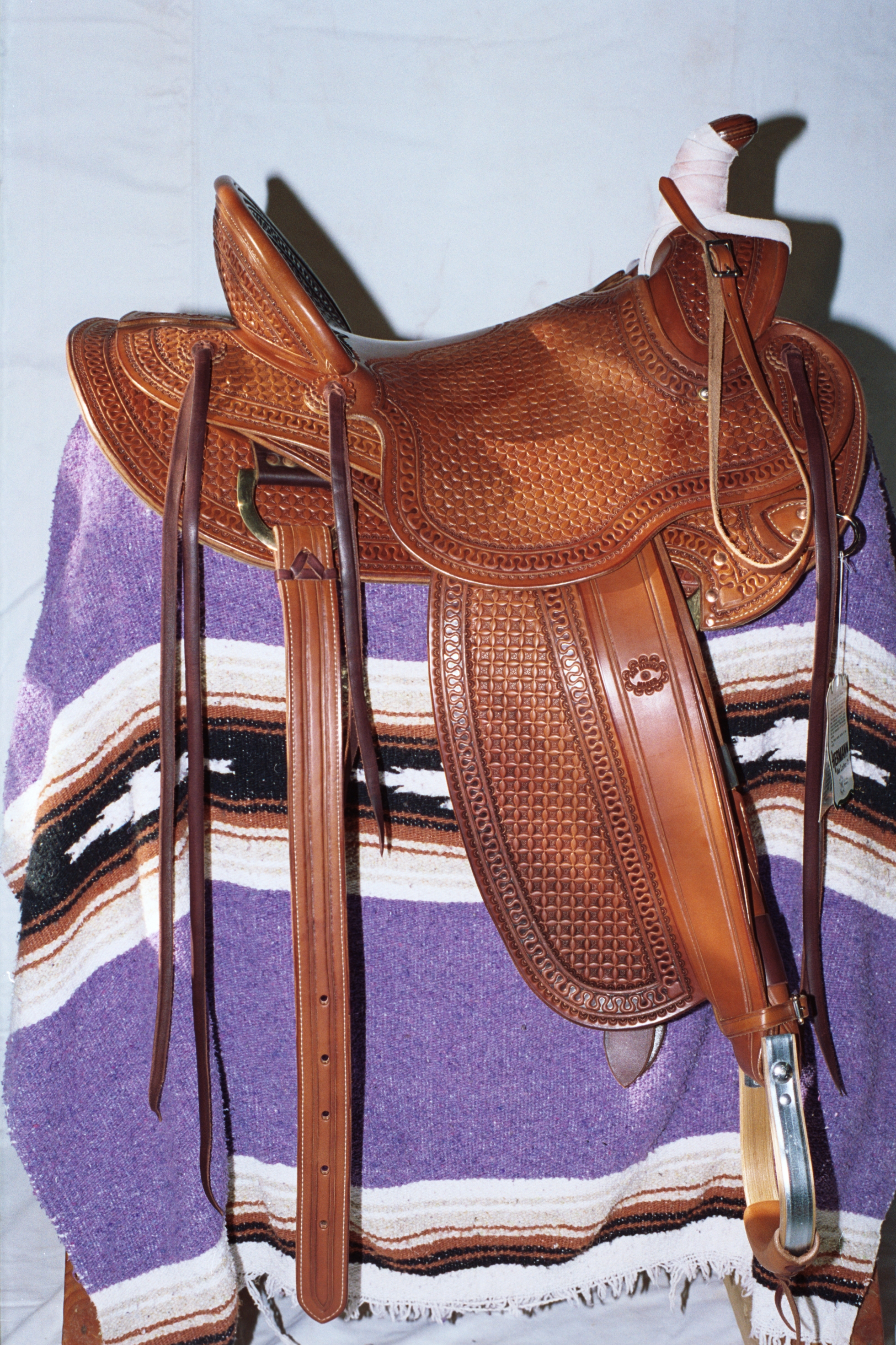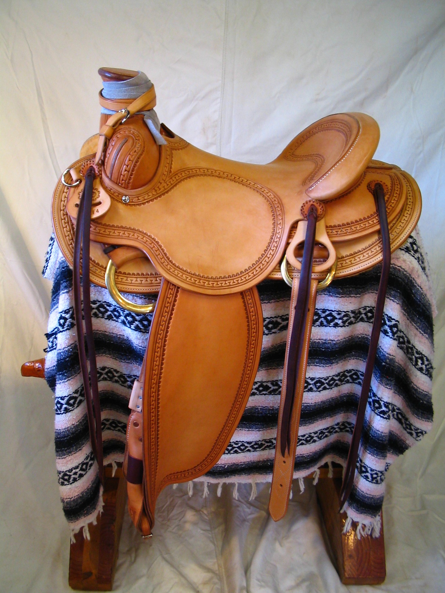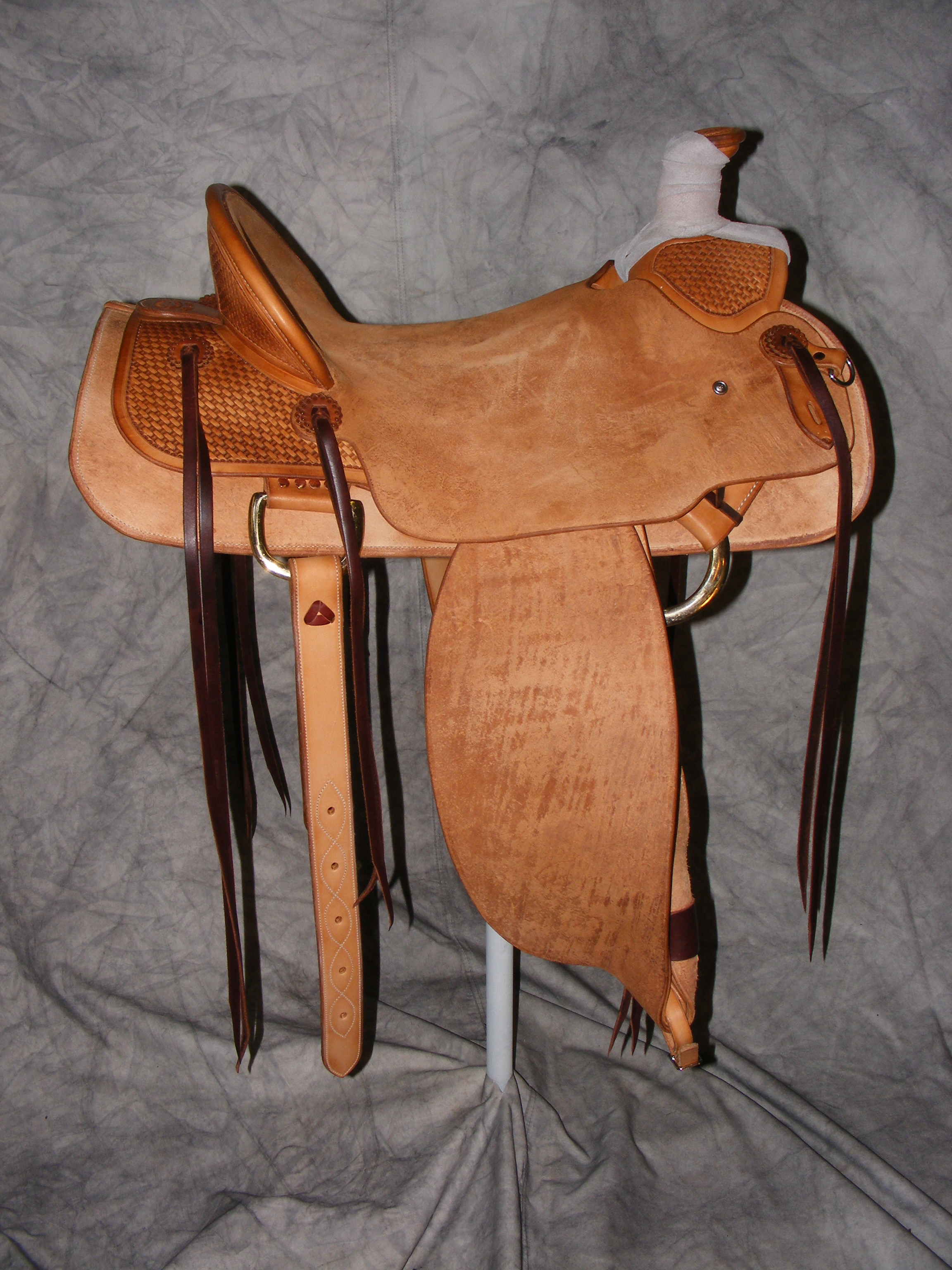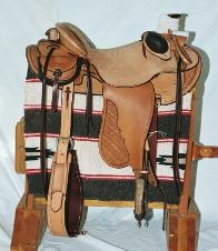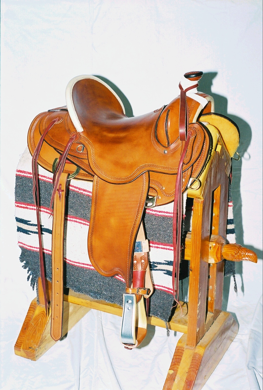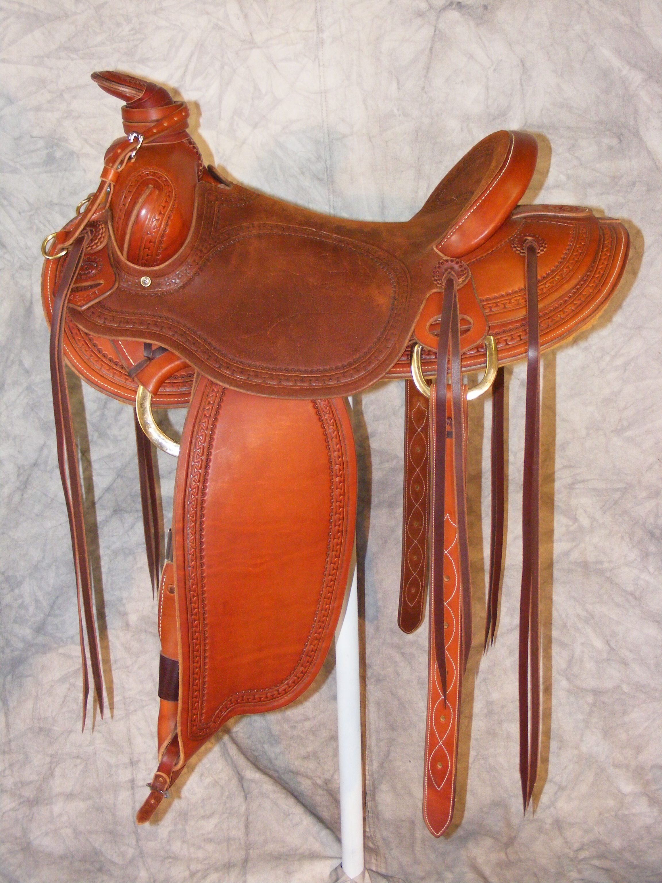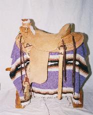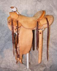 | Modified association with rawhide bound cantle and fork roll with chestnut leather |