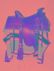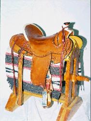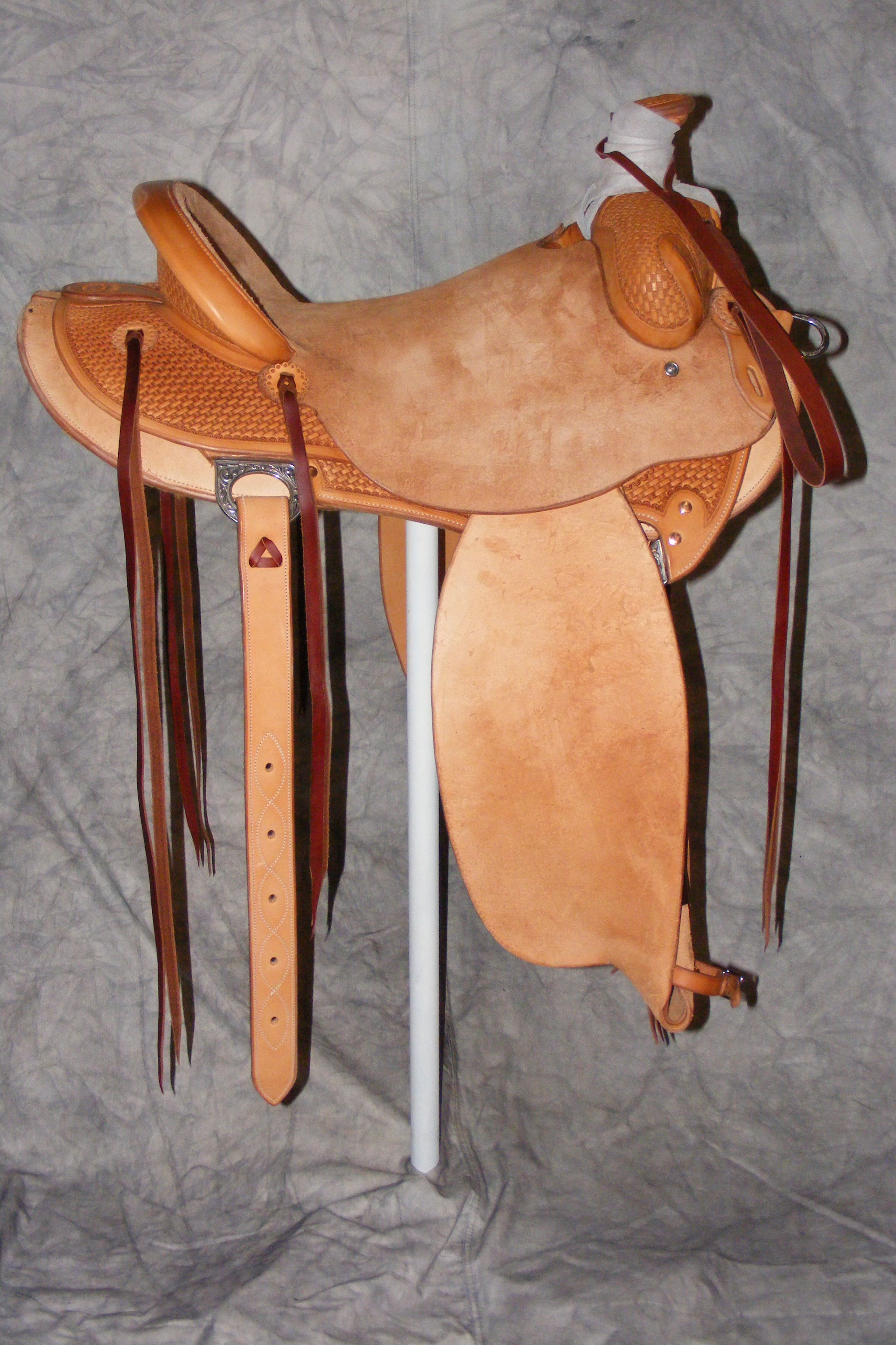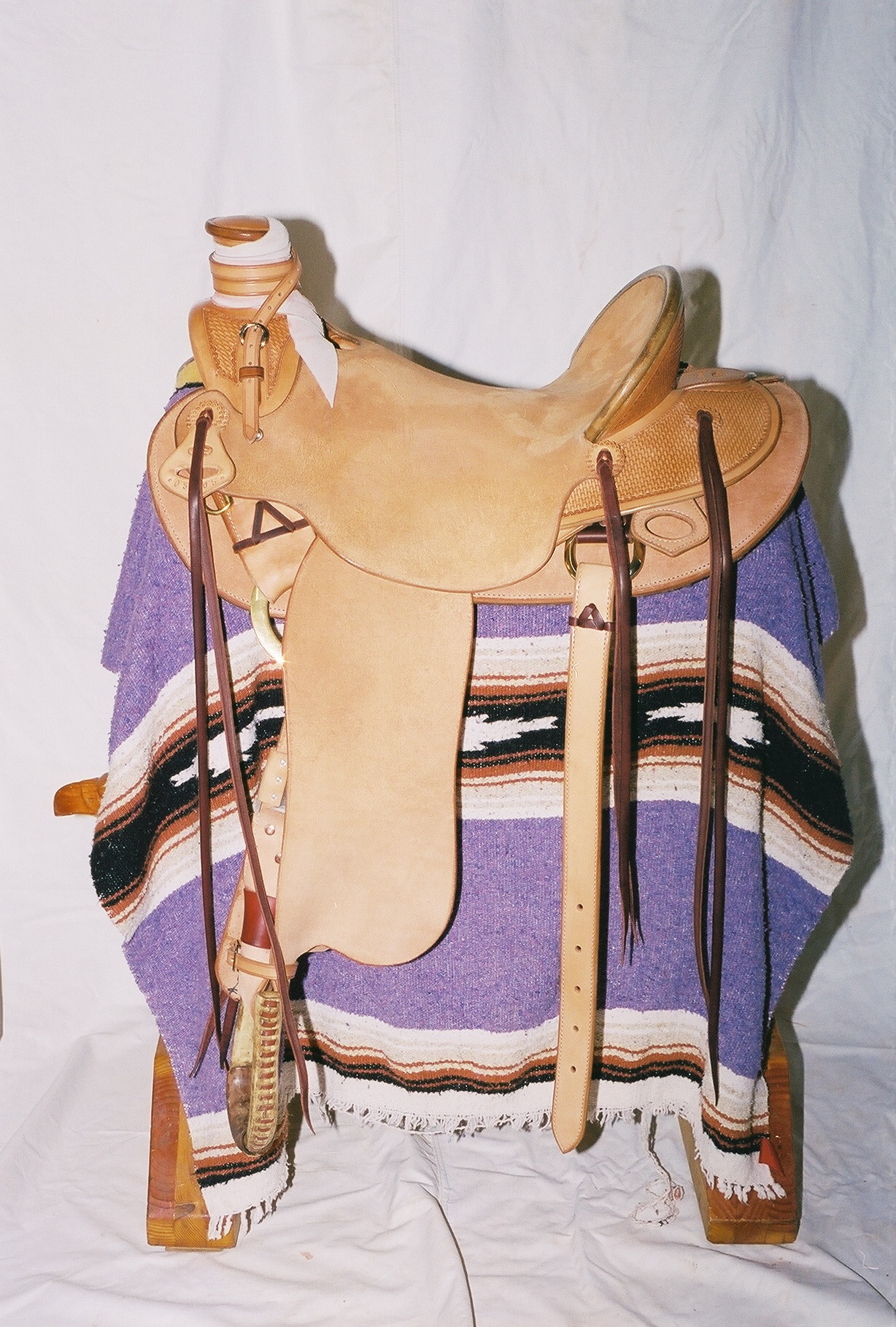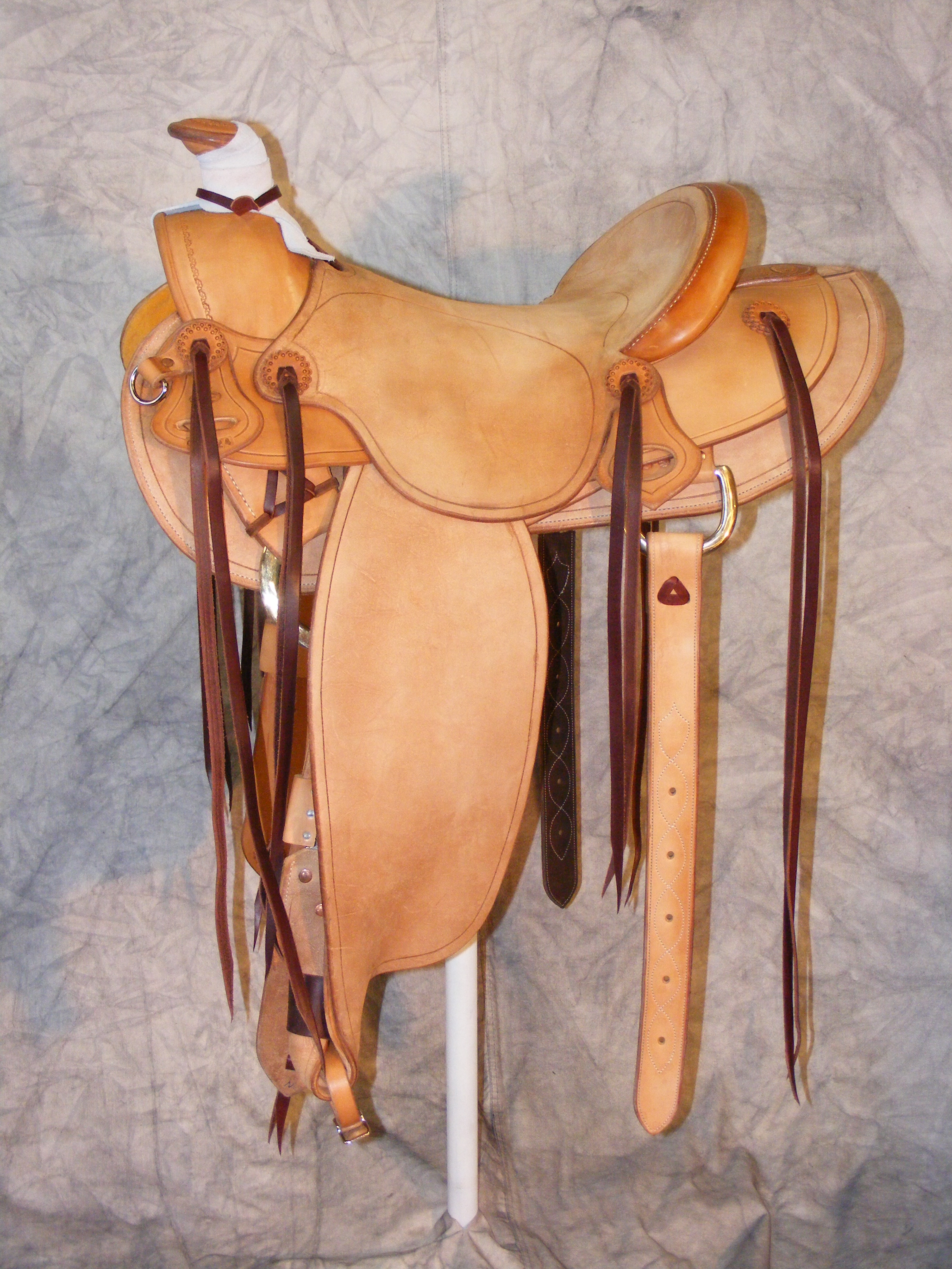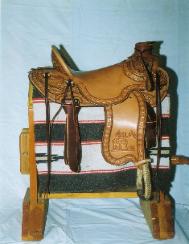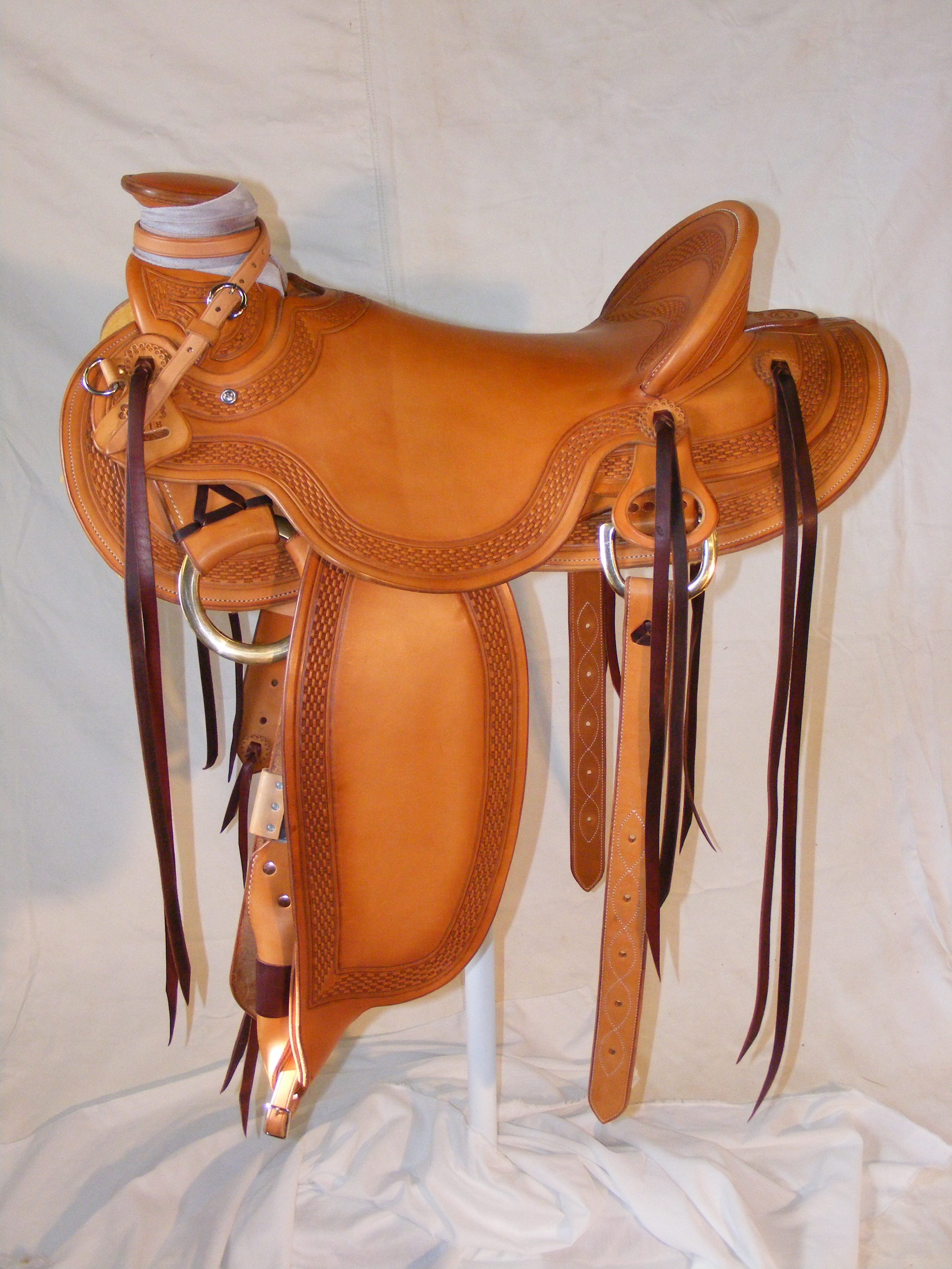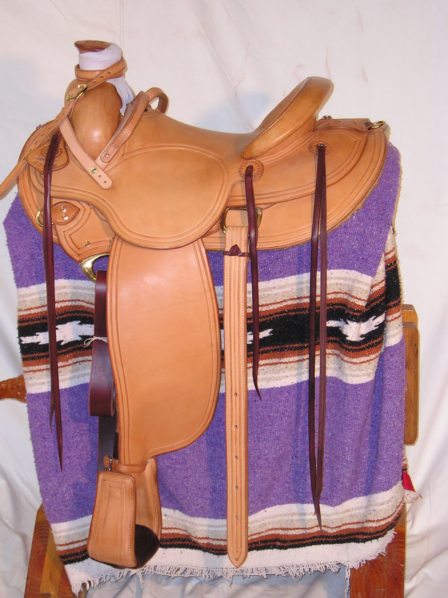 | Modified association with rawhide bound cantle and fork roll with chestnut leather |