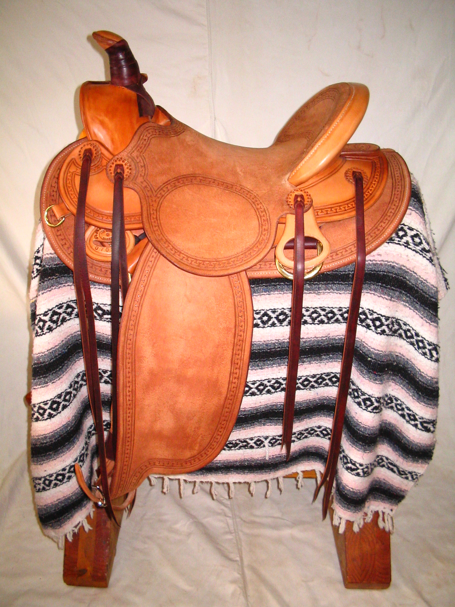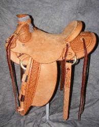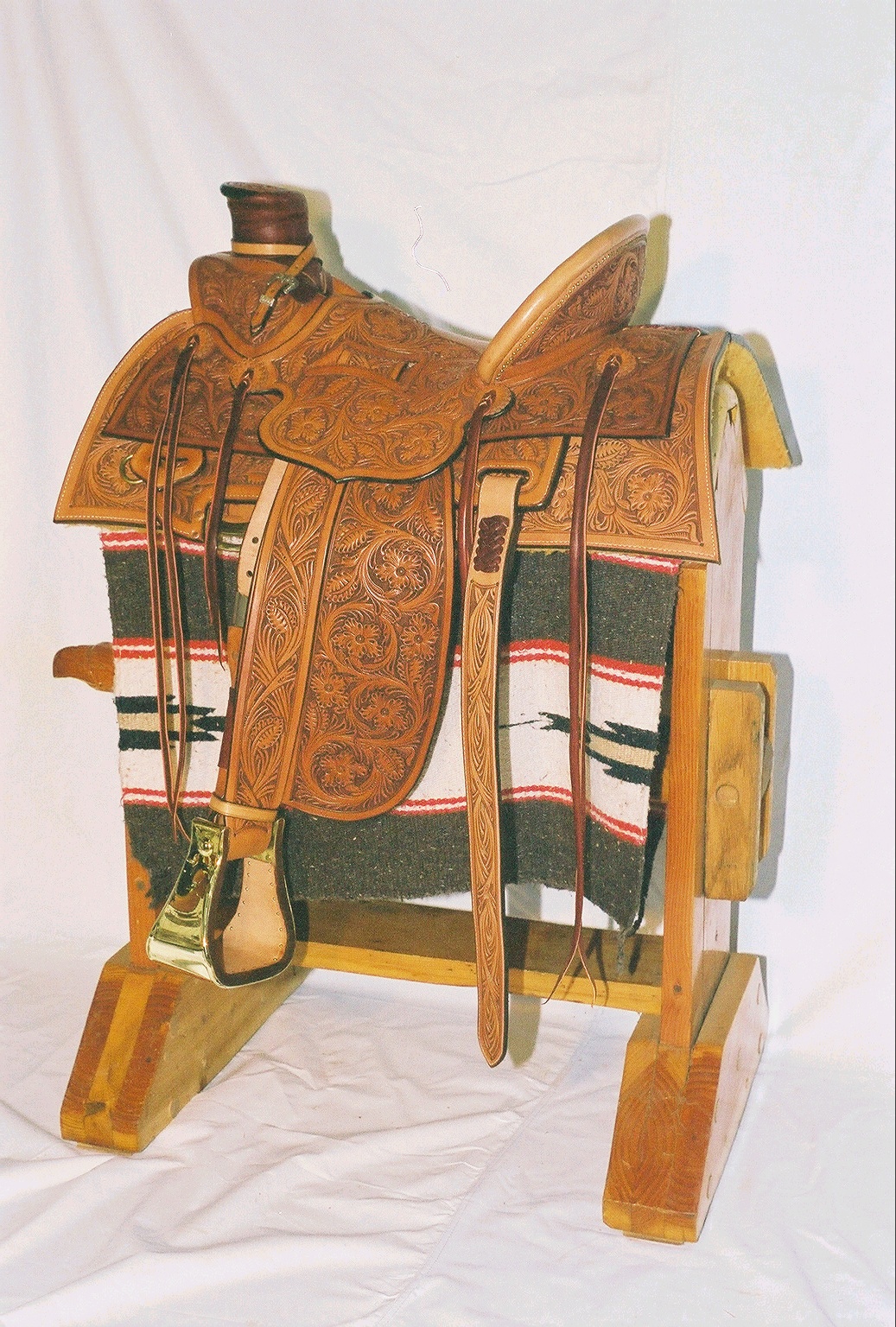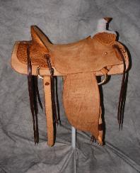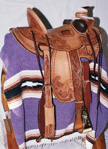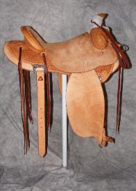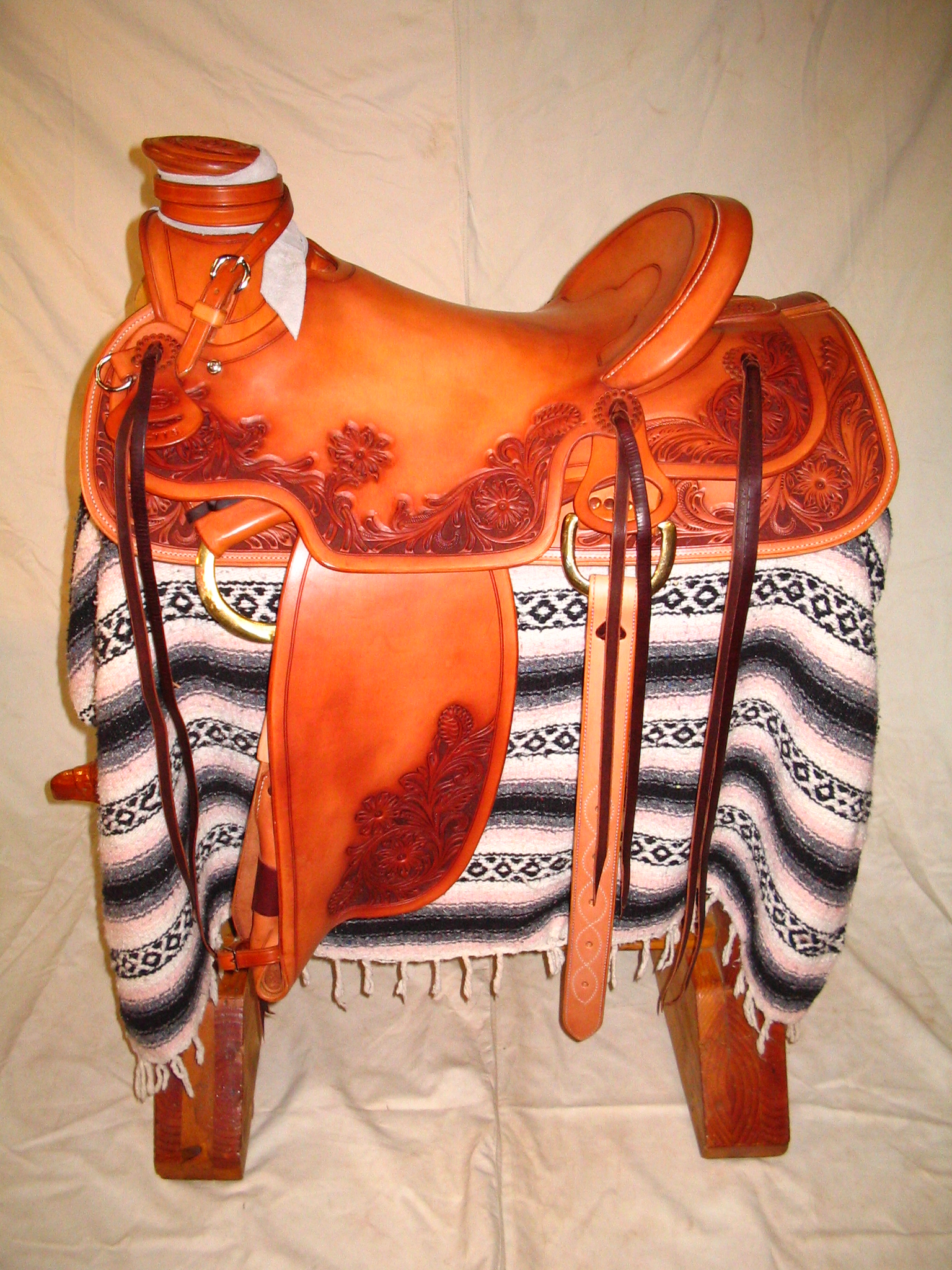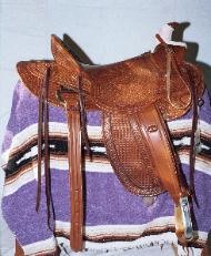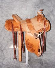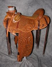 | partial floral carved with barbed wire border eight string loop seat and 5 1/2" shovel cantle |
