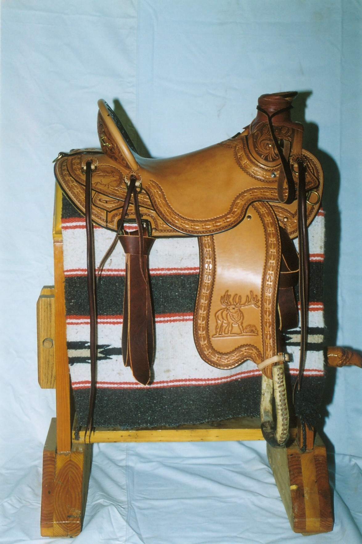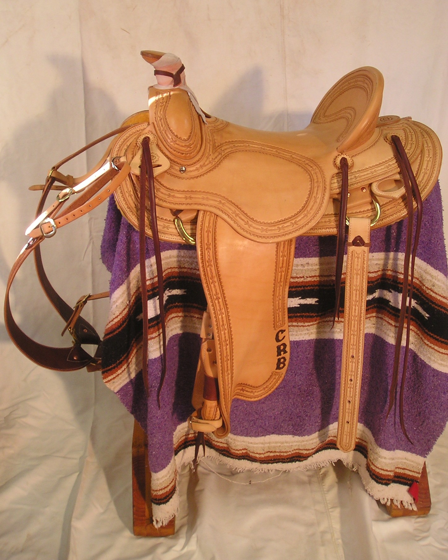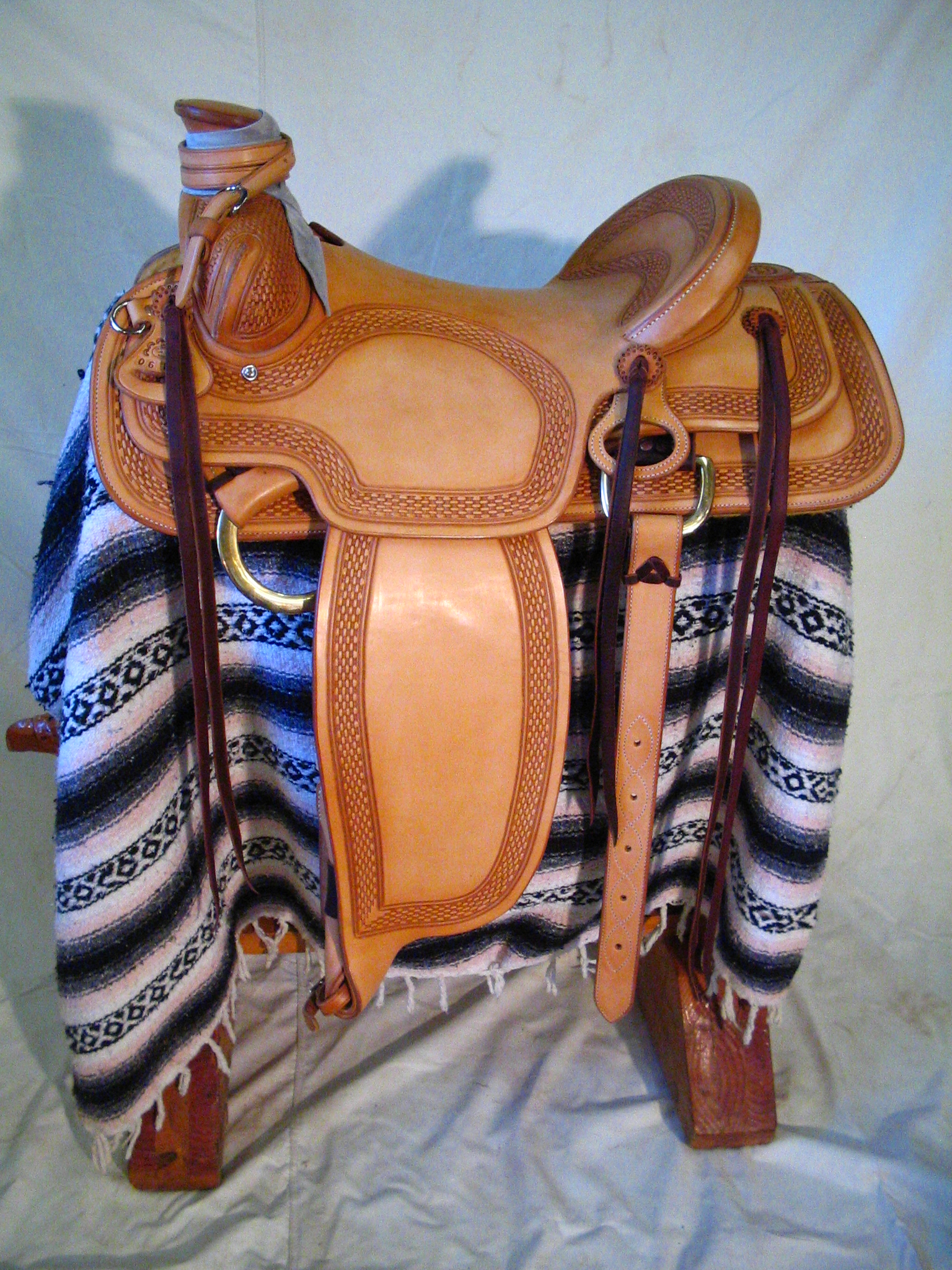 | partial floral carved with barbed wire border eight string loop seat and 5 1/2" shovel cantle |