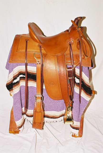 | Old fashioned eight string square skirt saddle with double bead border and 7/8 flat plate rigging |